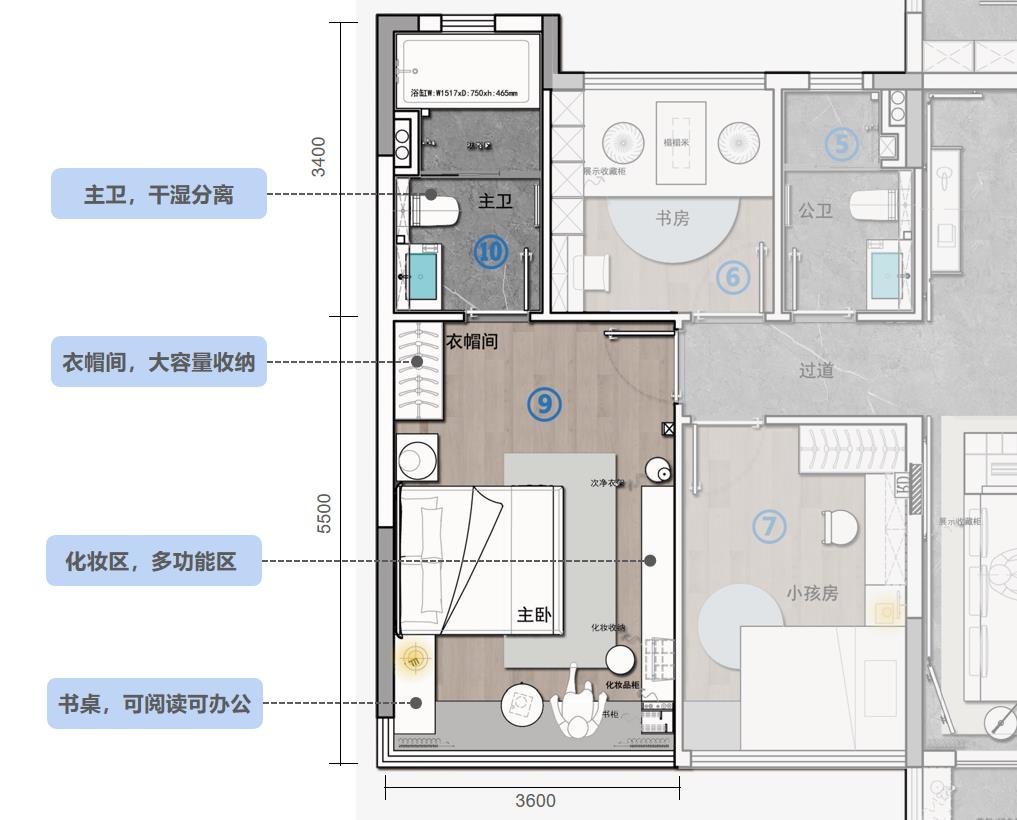 约5.5米+约3.4米的进深 ,突破传统主卧中“双人床+大衣柜”的单一设计,集起居、衣帽、 主卫 、自由四大功能于一体, 夫妻二人关上门就是一个独立的生活状态,可以各自学习、妆扮,互不干扰,通过 “主卧小家化“来实现对于个人空间及夫妻空间的需求。